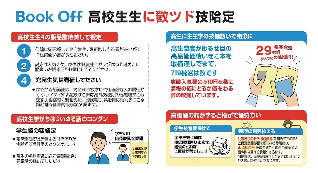 「ブックオフで本やゲームを売りたいけれど、高校生でも買取してもらえるのかな?」「18歳だけど高校生の場合、手続きはどうなるの?保護者の同意書は必要なんだろうか…」ブックオフの買取サービスを高校生が利用するにあたり、このような疑問や不安を抱えている方は少なくないでしょう。 特に、ブックオフで売る際の年齢確認の有無や、もし学生証だけで手続きができるのか、あるいはブックオフでは売らない方がいいものがあるのか、といった具体的な情報は見過ごせません。 また、ブックオフの買取がひどいという噂や、実際に買取を依頼するのが恥ずかしいと感じる場合の対処法など、気になる点は多岐にわたるはずです。 この記事では、ブックオフでの買取を検討している高校生の皆さんが抱えるこれらの疑問点を解消し、安心してサービスを利用できるよう、必要な情報を分かりやすく解説していきます。
