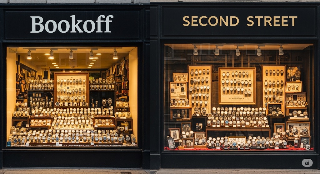 ブックオフは元々、本やCD・DVDの買取・販売が中心でしたが、近年ではアパレル、ブランド品、家電、そして時計など幅広いジャンルを取り扱っています。一方、セカンドストリートは衣料品や服飾雑貨に強みを持ちつつ、家具や家電、楽器、アウトドア用品、そして時計など、こちらも多岐にわたる商品を取り扱っています。